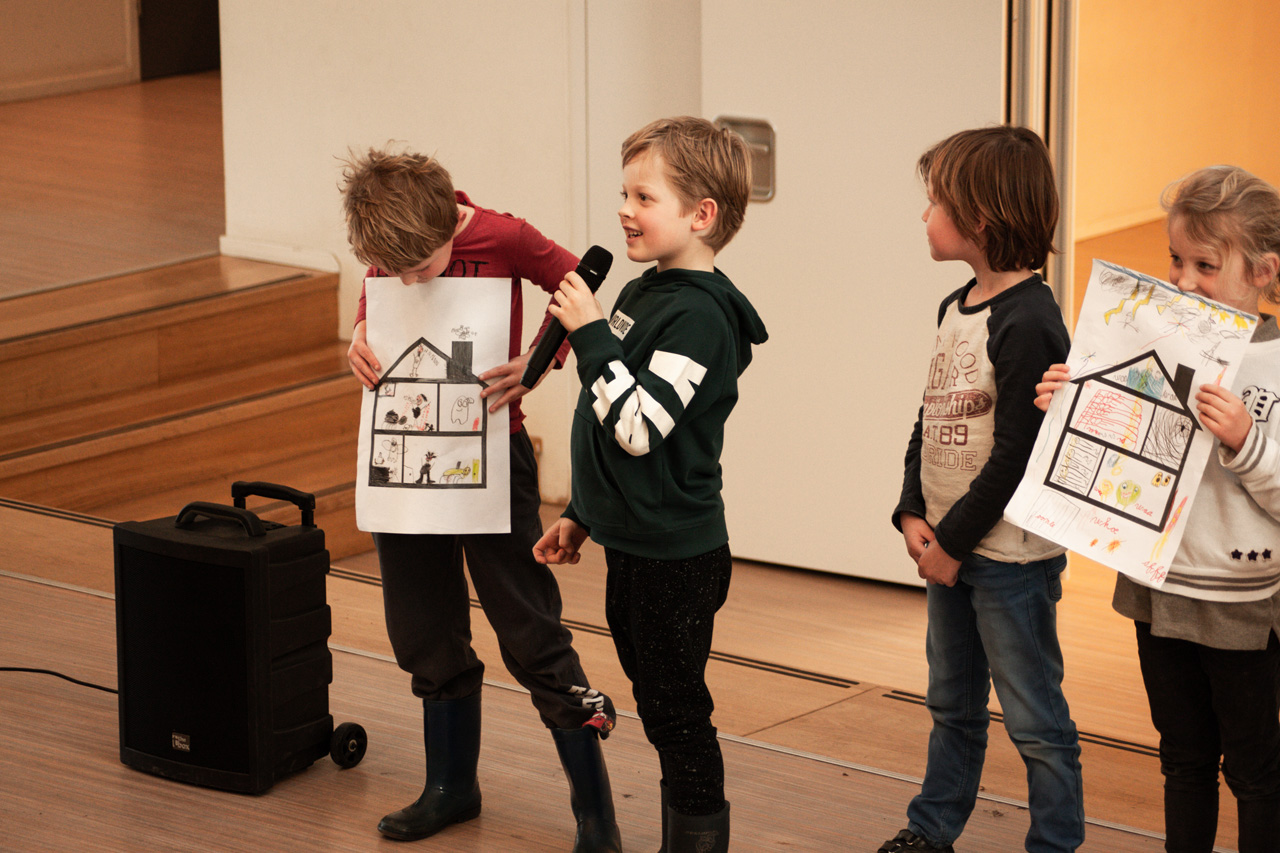 - Groep 3 en 4 zoeken tijdens de theatrale en muzikale workshop Het Magische Huis samen naar creatieve oplossingen voor de luidruchtige monstervriendjes in de droom van Buurmeisje Brenda.